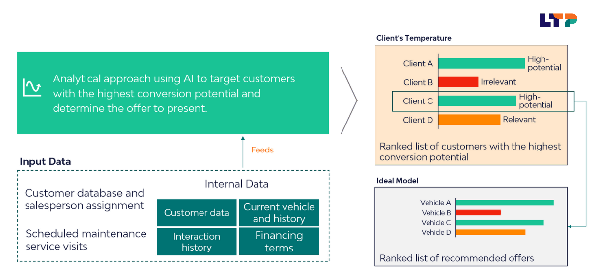 To further empower the sales team, these insights were enriched using GenAI. Based on the predictive outputs, GenAI generated tailored sales scripts that included the rationale for targeting a specific customer and a clear breakdown of the medium-term savings that could be achieved with the proposed vehicle. These savings included information that provided sales advisors with persuasive and client-specific arguments to support their conversations.